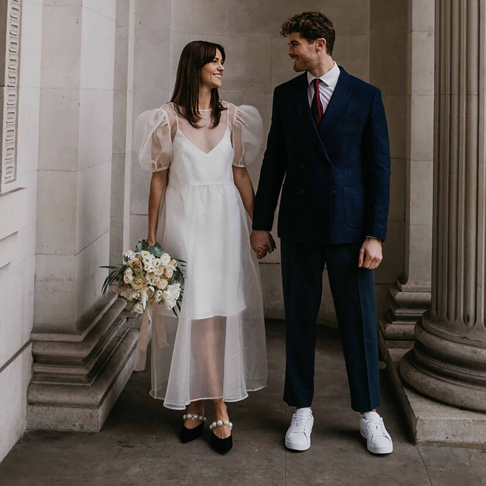 Short Puff Sleeves Organza Illusion Spaghetti Strap Bridal Gown Custom Made Backless Two Pieces Simple Midi Length Wedding Dress