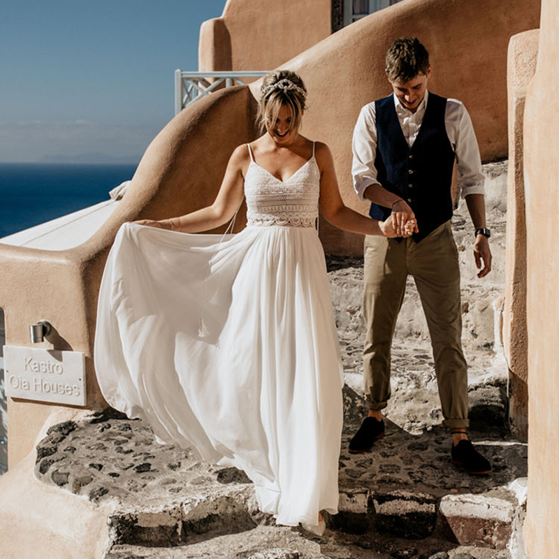Two Piece Boho Chiffon Wedding Dress Crop Top Bohemian Drop Ship Backless Princess Beach Spaghetti Straps Lace Bridal Gown