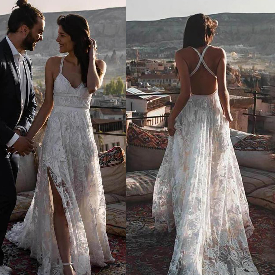 Halter Rose Floral Lace Beach Wedding Dress Custom Made Crisscross Backless A Line Spaghetti Strap Rustic High Split Bridal Gown