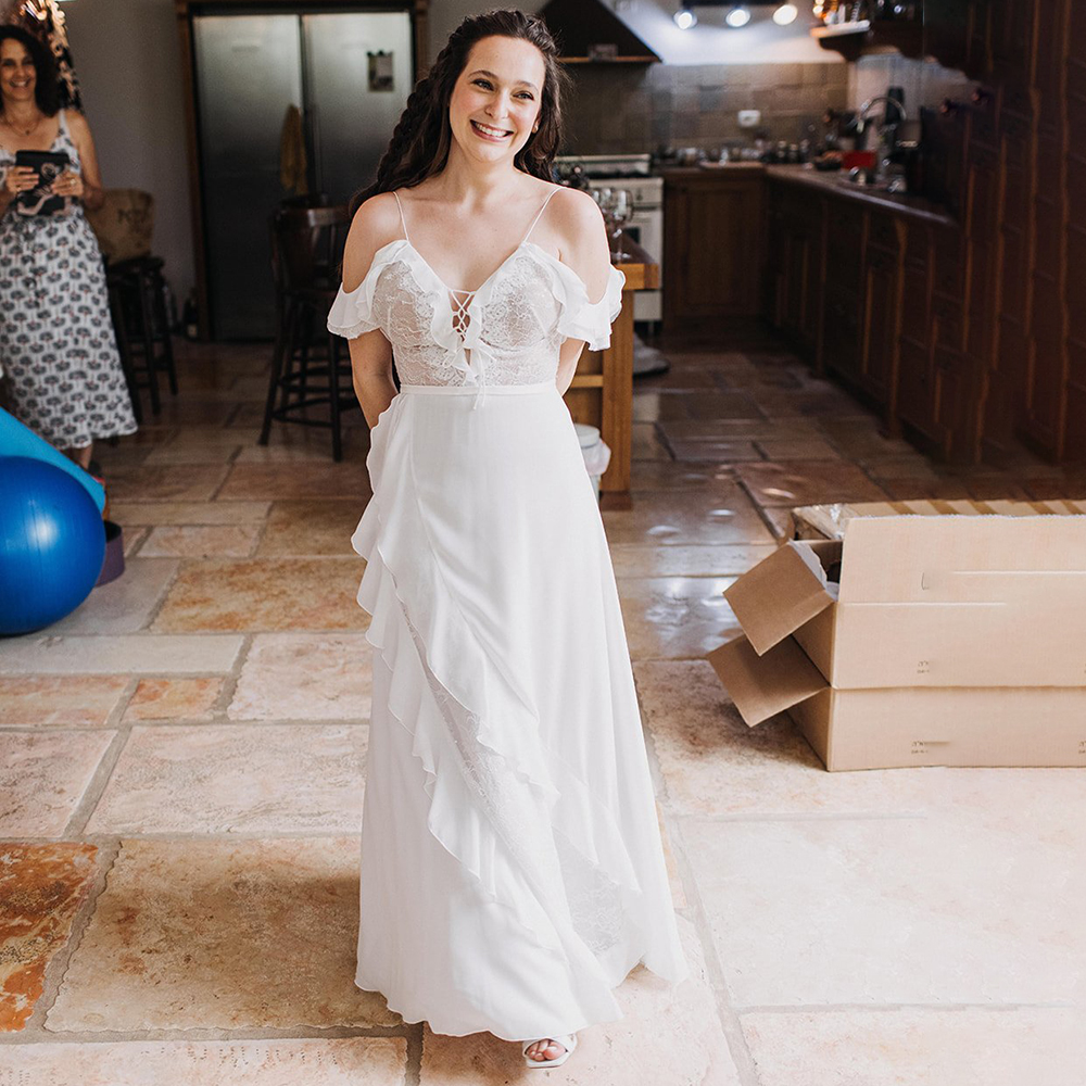 Boho Lace Up Ruffled Chiffon A Line Wedding Gown Custom Made A Line V Neck Dropped Sleeves Backless See Through Lac Bridal Dress