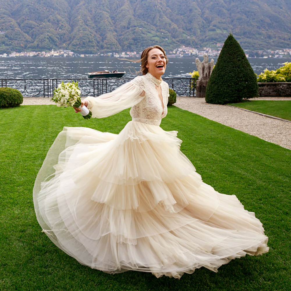 Long Bishop Sleeves High Neck Tiered Mesh Wedding Ball Gown Open Back Vintage Rustic Deep V Keyhole Lace Puffy Bridal Dress