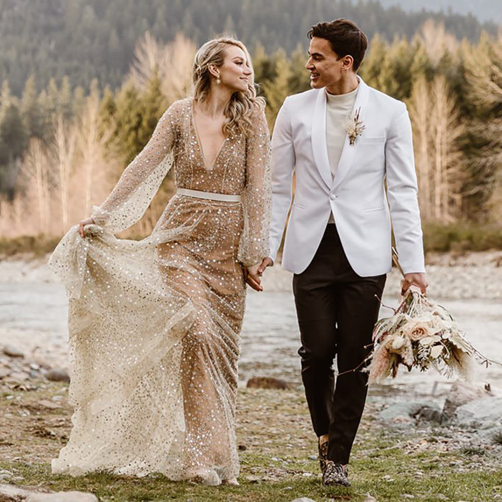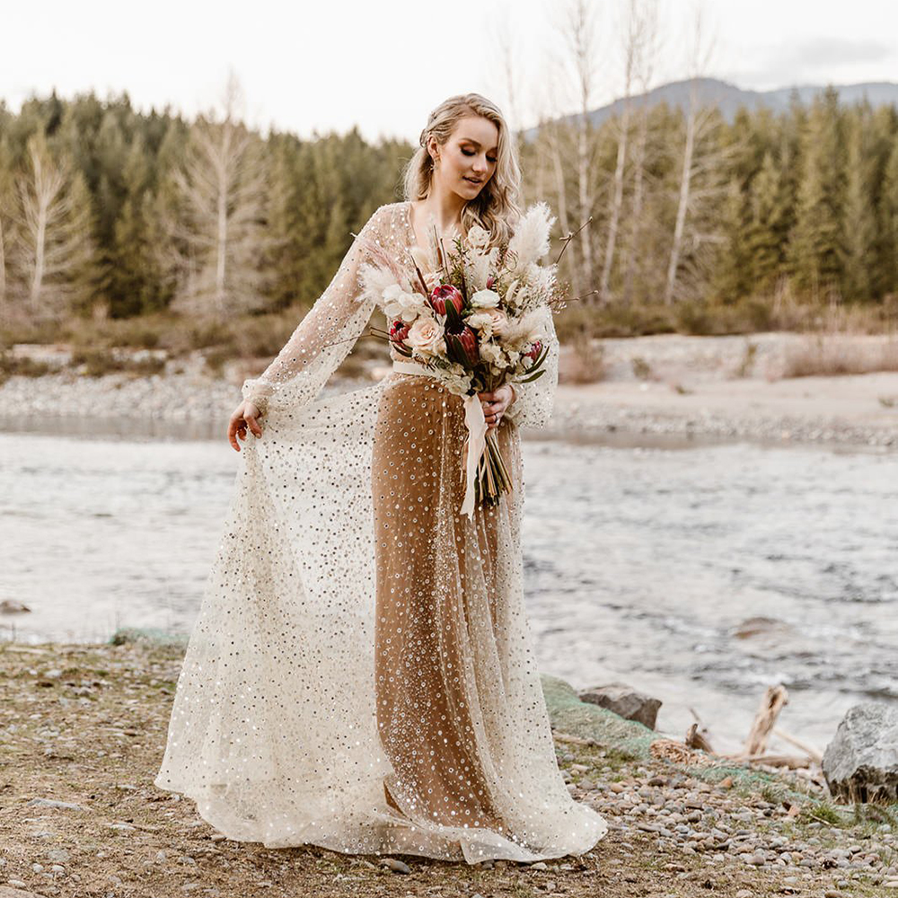 Luxury Beading Tulle A Line V Neck Wedding Dress Custom Made Backless Maxi Beach Sequined Long Puff Sleeves Shimmer Bridal Gown