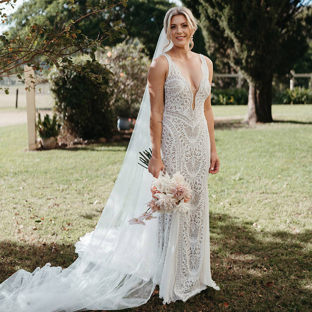 Mermaid Rustic Lace Deep V Neck Wedding Gown Low Cut Open Back Chiffon Backless Sleeveless Real Photos Elopement Bridal Dress