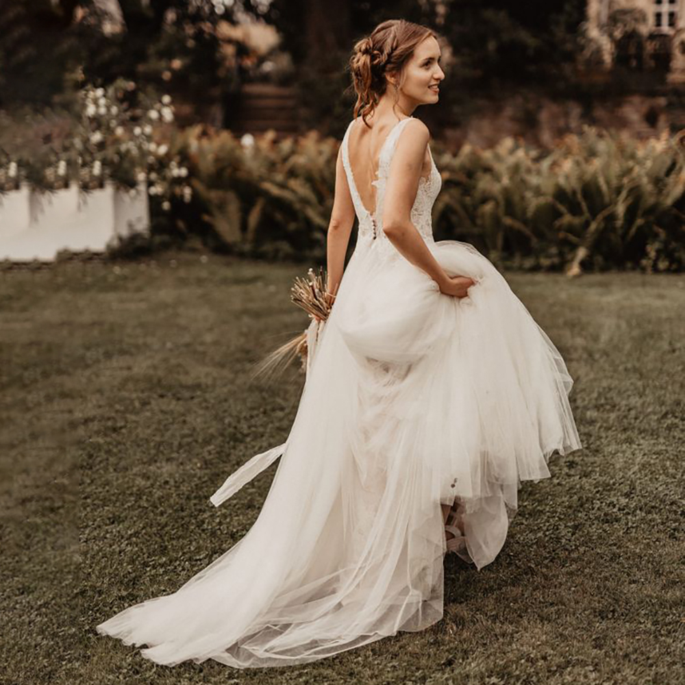 Rustic V Neckline Open Back Tulle Wedding Dress Custom Made Boho Garden Backless A Line Floral Lace Maxi Sleeveless Bridal Gowns