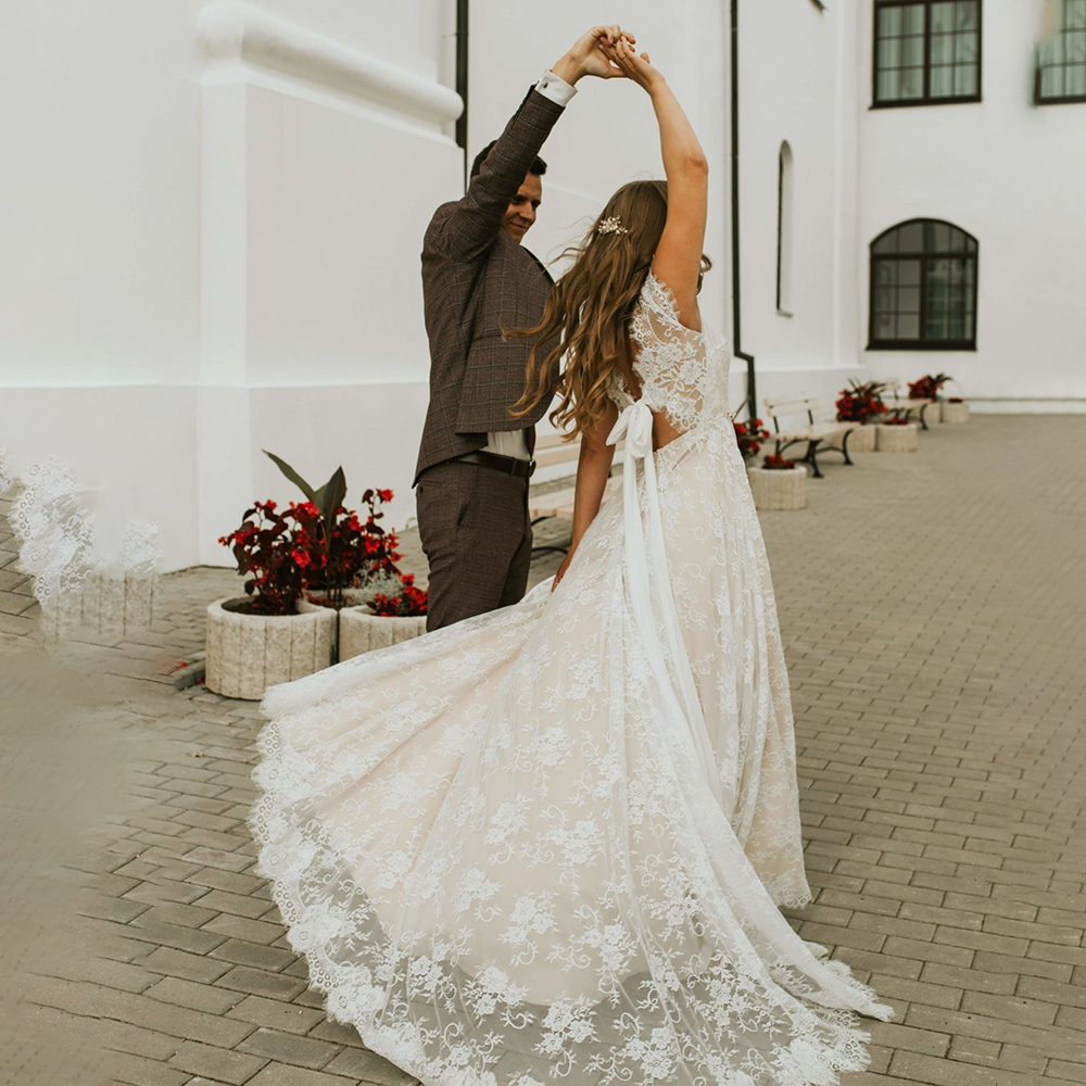 Short Capped Sleeves Boho Lace A Line Bridal Gowns Hollow Open Back Custom Made Self-Tie Chiffon Sash V Neck Wedding Dress
