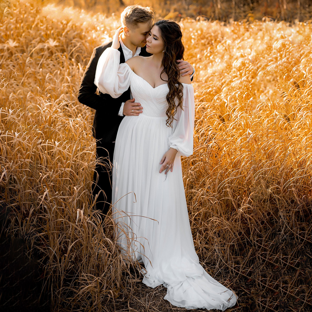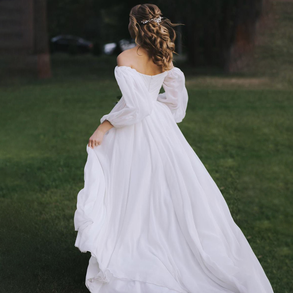 A Line Off Shoulder Chiffon Backless Wedding Dress Simple Custom Made Plus Size Long Bishop Sleeves Minimalist Bridal Gowns