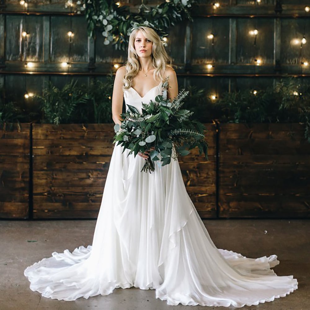 Low Cut V Neck Silkky Chiffon Wedding Dress Spaghetti Strap Sex Backless Simple Flowy Custom Made Draped Skirt Bridal Gowns