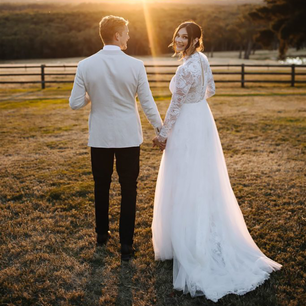 High Neck Rustic Long Sleeves Wedding Dress Illusion Sweetheart Custom Made A Line Tulle Skirt Backyard Floral Lace Bridal Gown