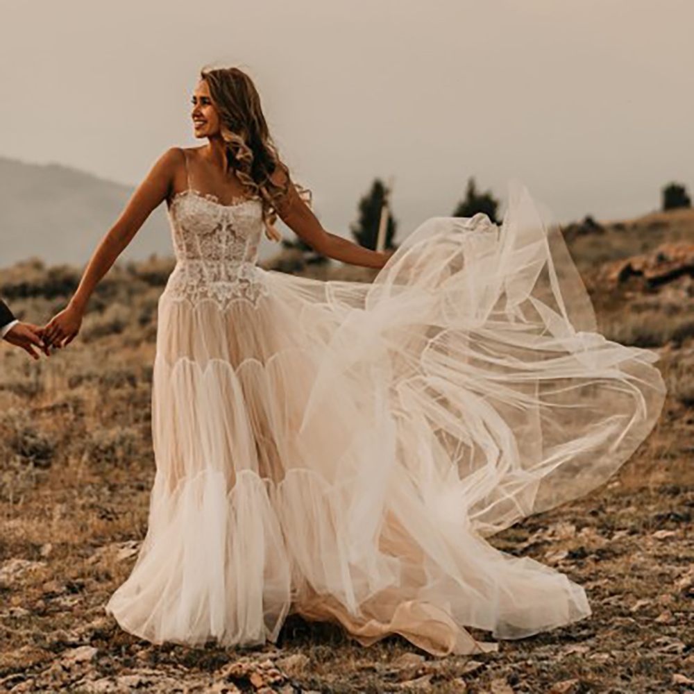 Spaghetti Straps Tiered Tulle Boho A Line Outdoor Wedding Gown Custom Made Open Back Appliqued Rustic Elopement Bridal Dress