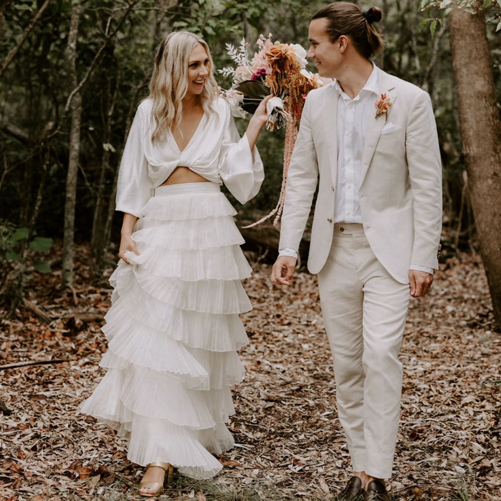 Twaist Crop Top 3/4 Sleeves Wedding Separate Dress Open Back Custom Made Full Length Tiered Ruffled Tulle Minimalist Bridal Gown