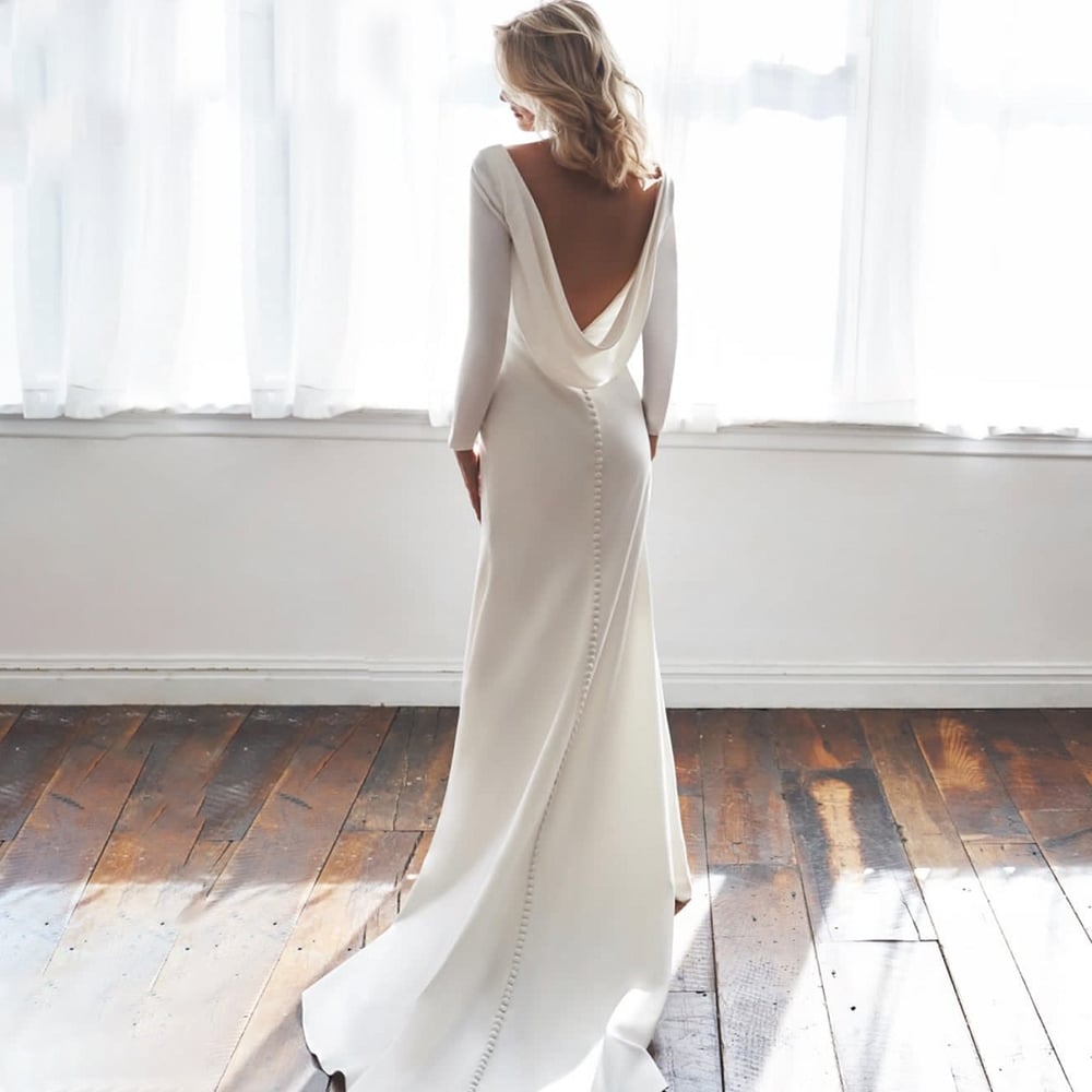 Bateau Satin Simple Modest Wedding Dress Long Fitted Sleeves Custom Made Cowl Drape Open Back Brush Train Crepe Bridal Gowns