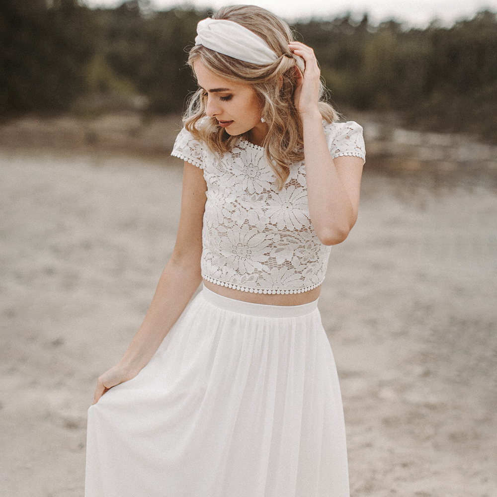 Cap Sleeve Lace Crop Top Chiffon Skirted Wedding Separate Dress Custom Made Big Size Low Cut Button Maxi Boho Rustic Bridal Gown