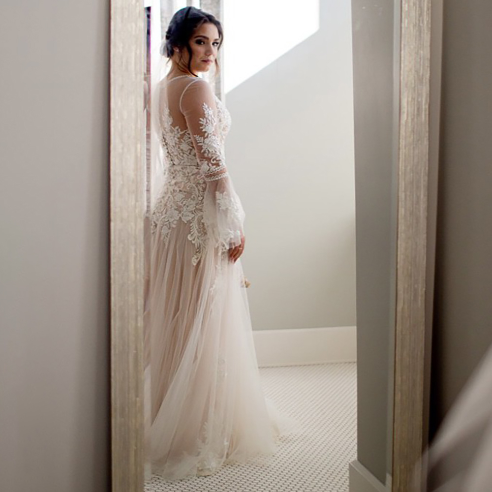 Feminine Whimsical Long Bell Sleeves Embroidery Lace Wedding Gowns Custom Made A Line Boho High Split Skirt Tulle Bridal Dress