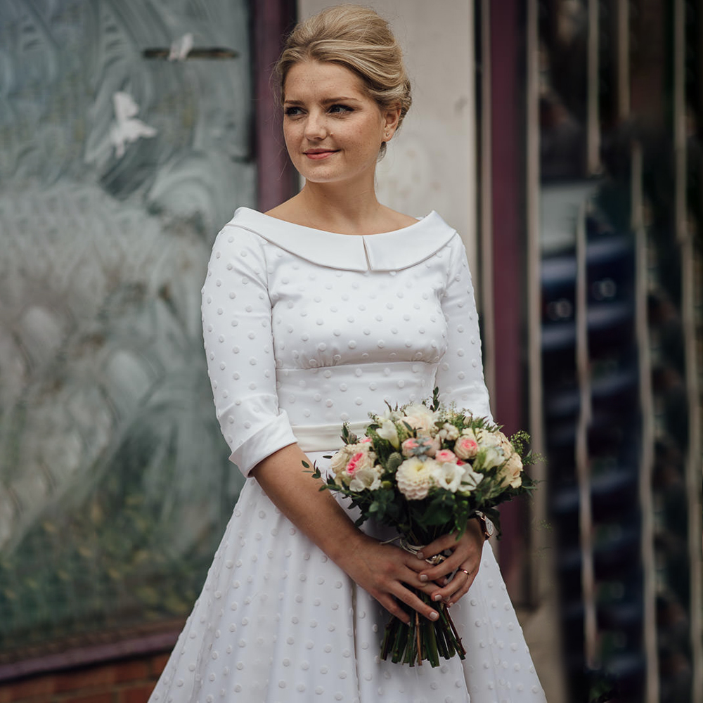 Tea Length Victorian Polka Dotted Wedding Dress Custom Made Half Sleeves Turn Down Collar Midi Tulle Vintage Bridal Gowns