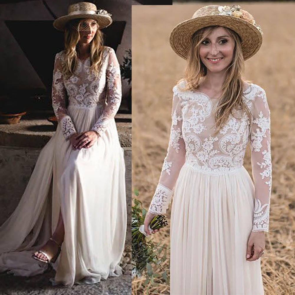 Backyard Outdoor Chiffon Wedding Dress Plus Size A Line Custom Made Floral Appliques Backless High Slit Bateau Neck Bridal Gowns