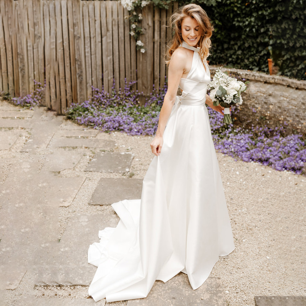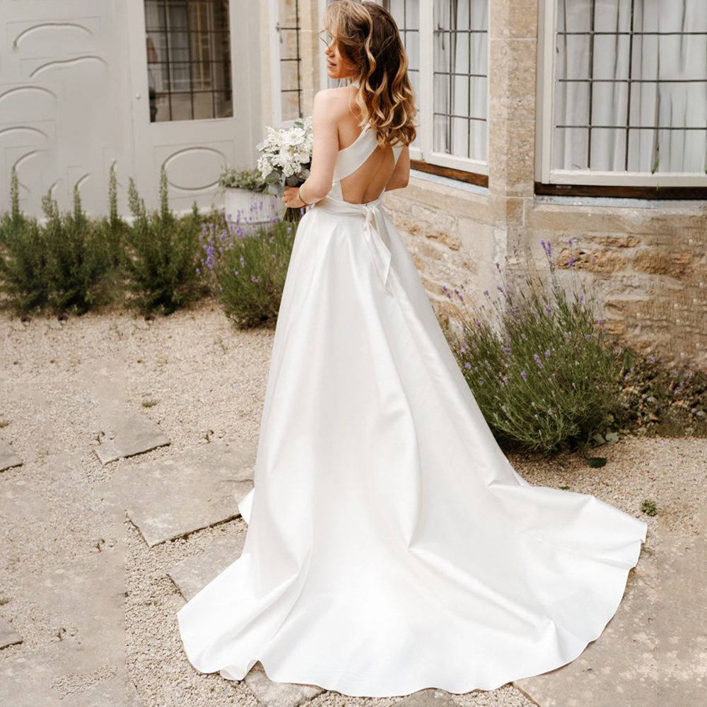 Halter Round Satin Open Back A Line Wedding Dress Criss Cross Sleeveless Custom Made Plus Size Sash Elegant White Bridal Gowns