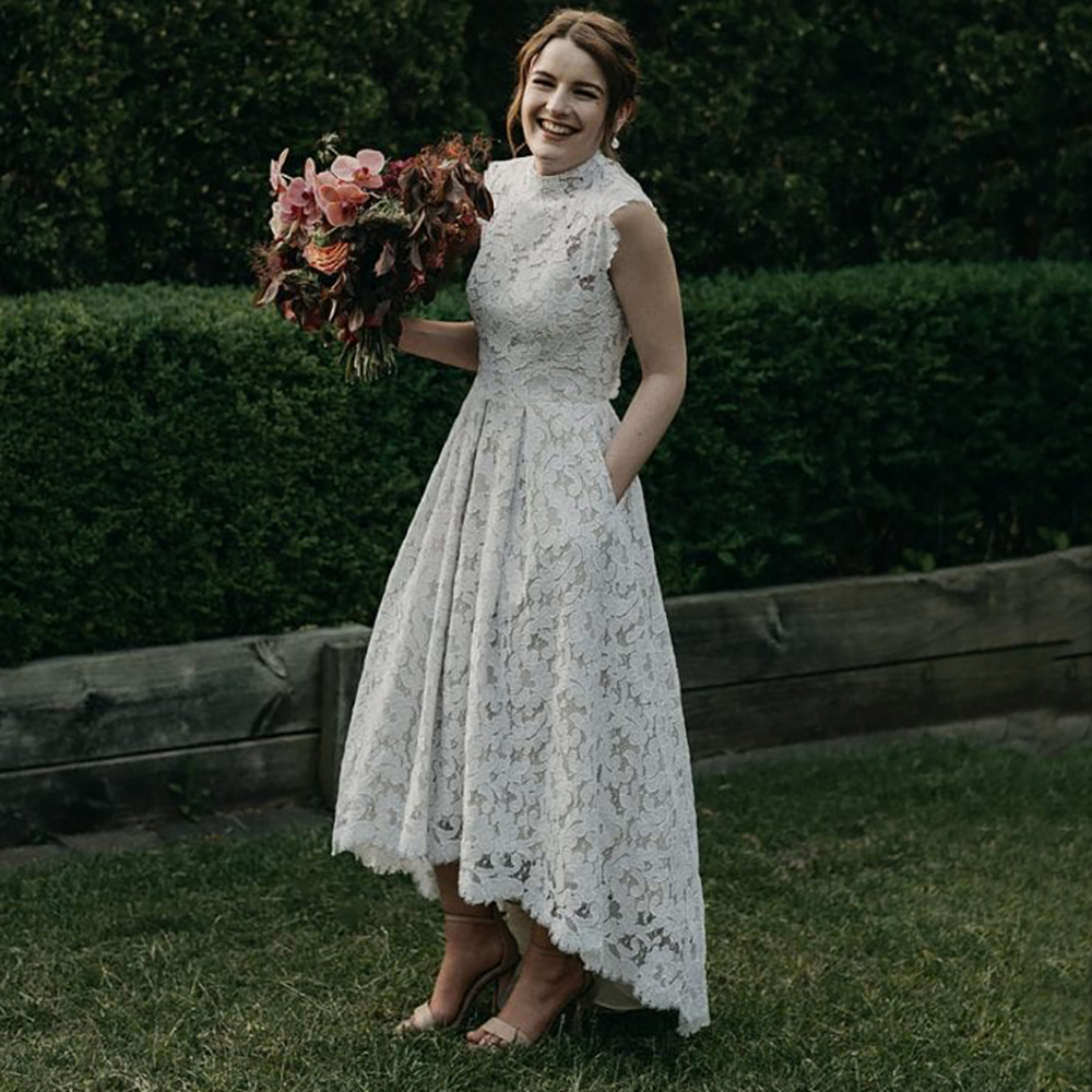 High Neck Irregular Length Lace Boho Bridal Gown Plus Size Ankle Length Hollow Open Back Backyard Outdoor High Low Wedding Dress