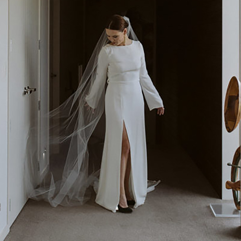 High Split Crape Backless Minimalist Wedding Dress Drop Ship Custom Made Plus Size Boat Neck Cowl Drape Backless Bridal Gowns