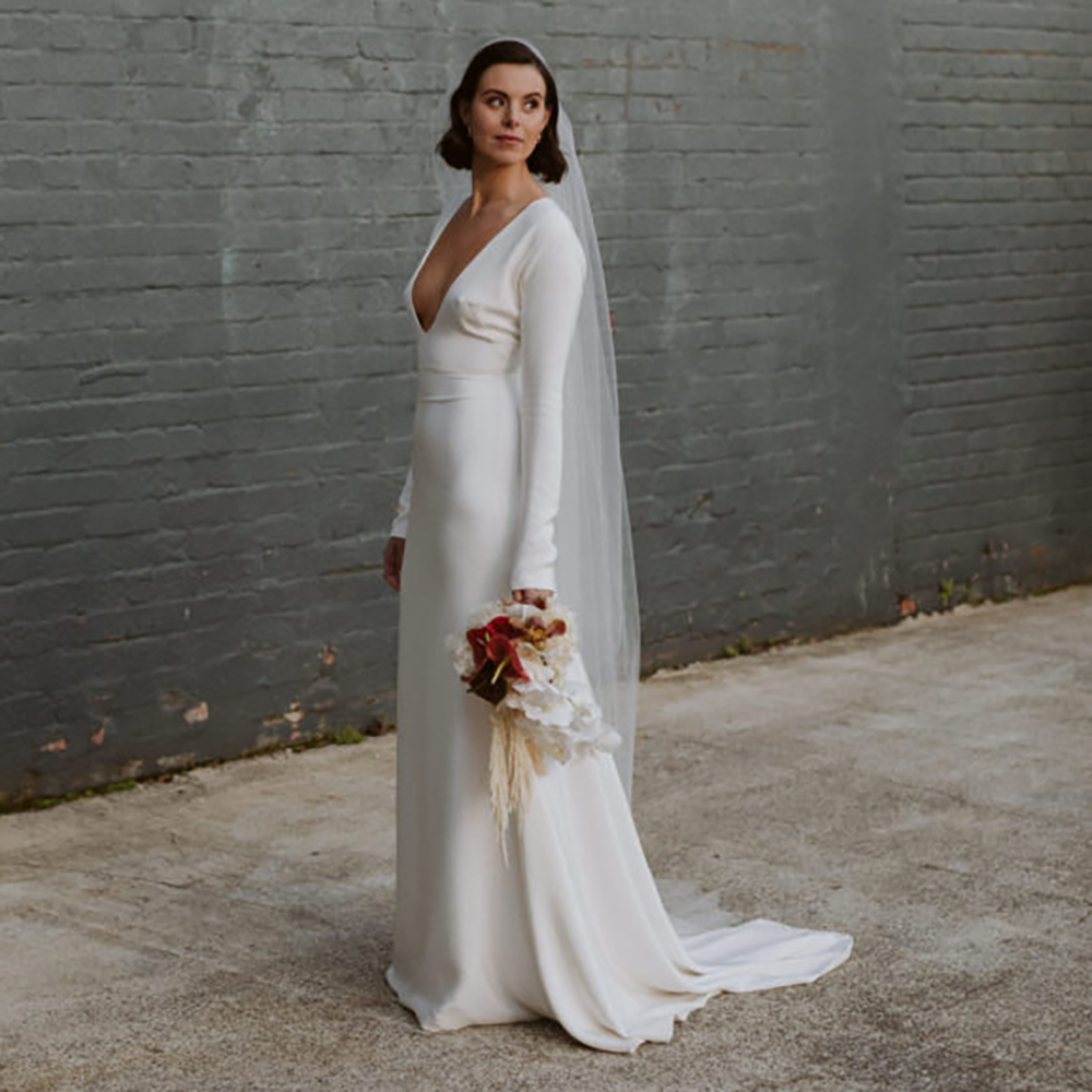 Luxe Deep V Neck Long Fitted Sleeves Wedding Dress Custom Made Plus Size A Line Crepe Closed Back Zipper Elegant Bridal Gown