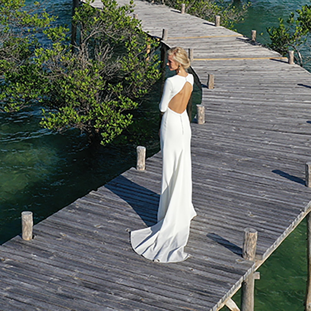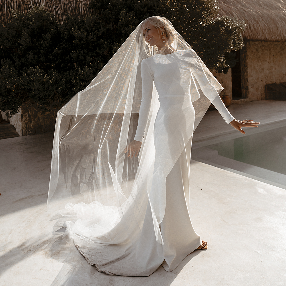 Round Neck Long Fitted Sleeves Sheath Satin Wedding Dress Drop Ship Open Back Covered Buttons Crepe Beach Column Bridal Gowns
