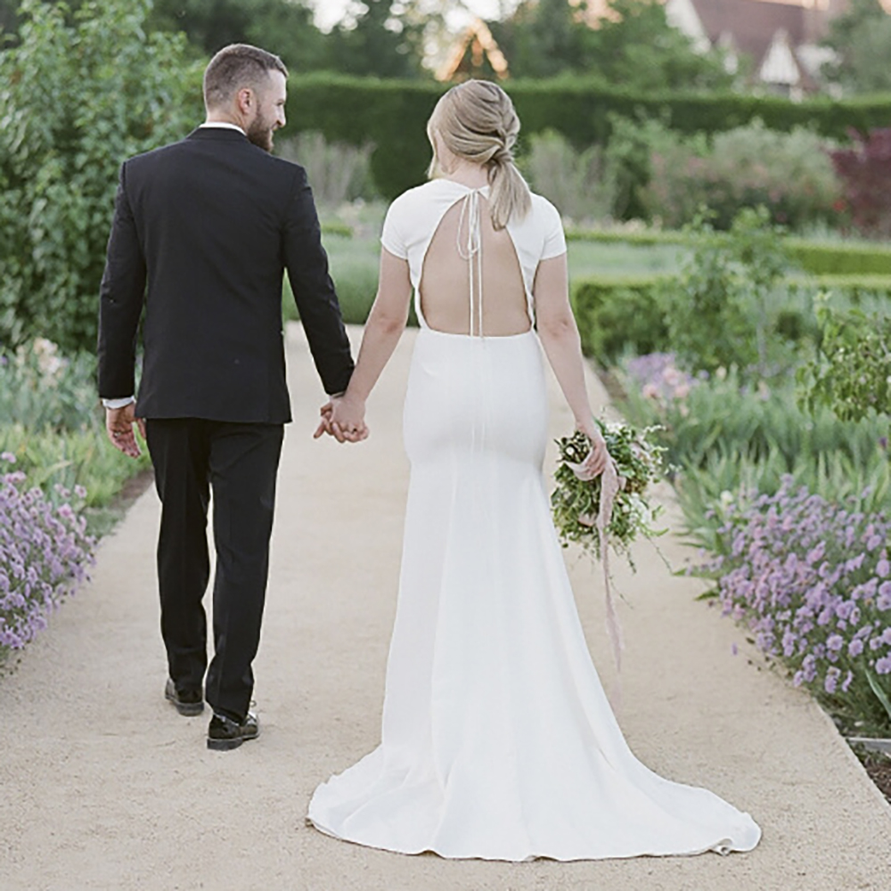 Sheath Hollow Back Crepe Minimalist Wedding Dress Drop Ship Simple Custom Made Plus Size Drape Jewel Short Sleeves Bridal Gowns