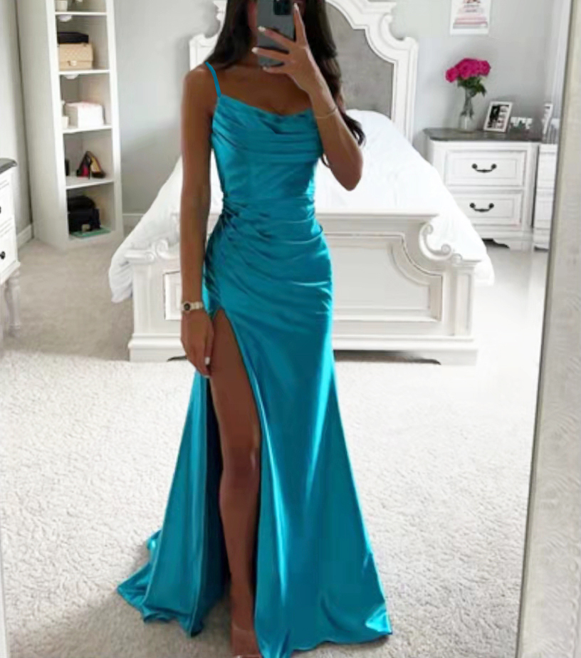 Spaghetti Straps Mermaid Evening Dresses Long Satin Boat Neck Formal Party Dress