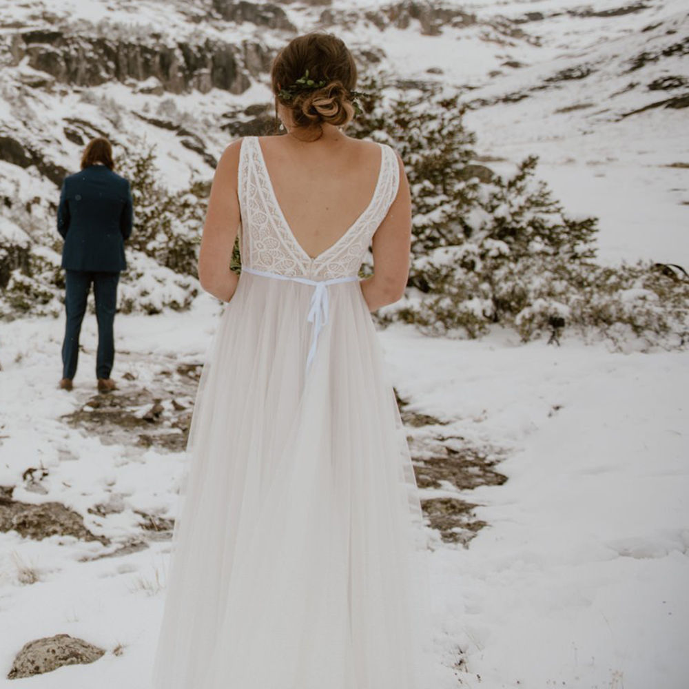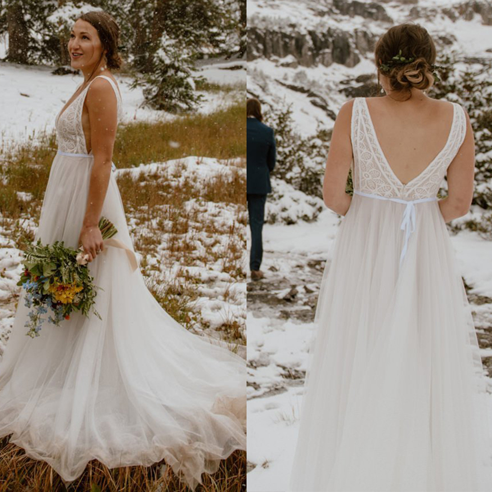 Boho Lace Side Cutouts Tulle A Line Wedding Dress Backless Maxi Custom Made Plus Size V Neckline Pearl Sash Bridal Gowns