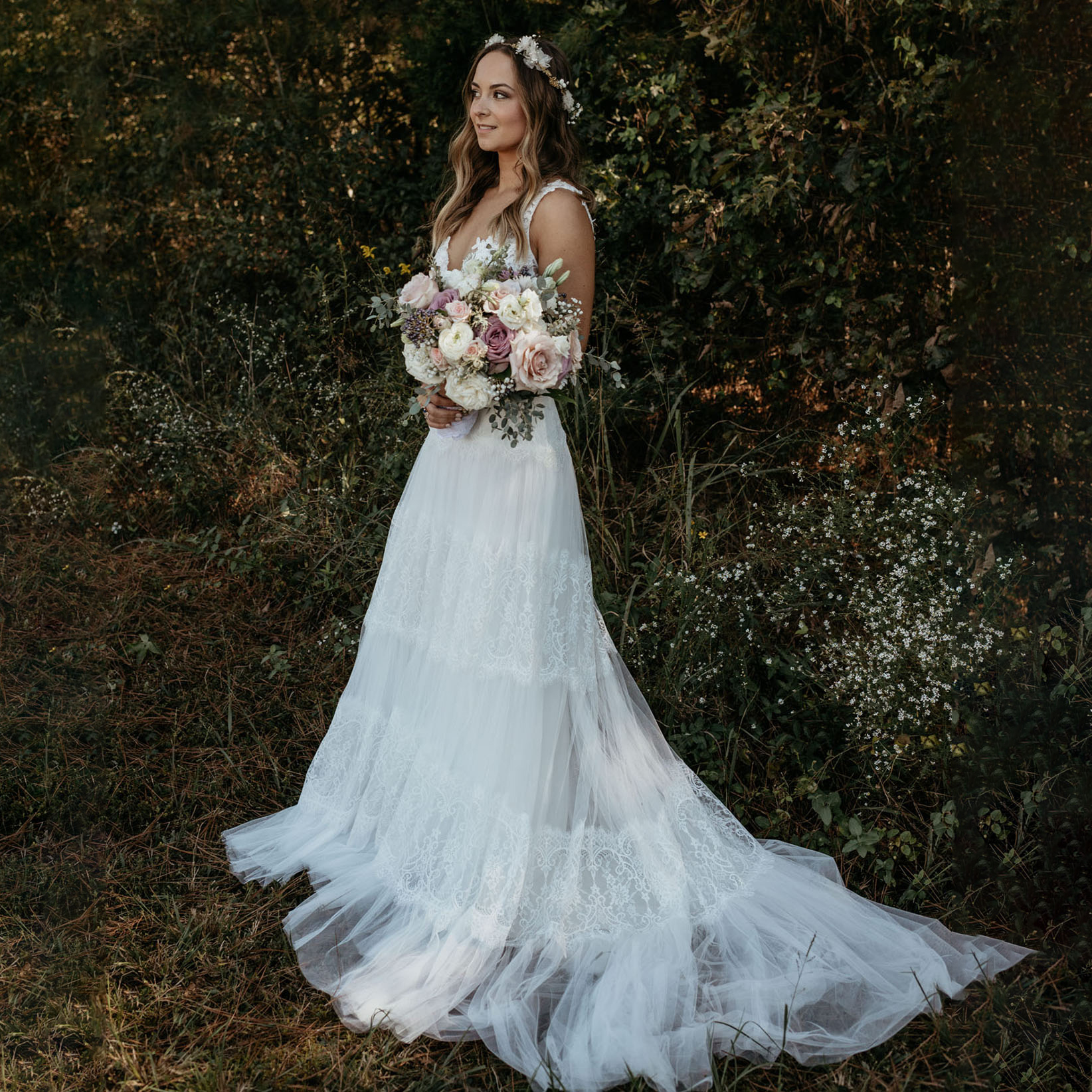 Low V Neck Boho Beach Appliqued Bridal Gown Custom Made Lace Overlay Elopement Photography Backless Destination Wedding Dress