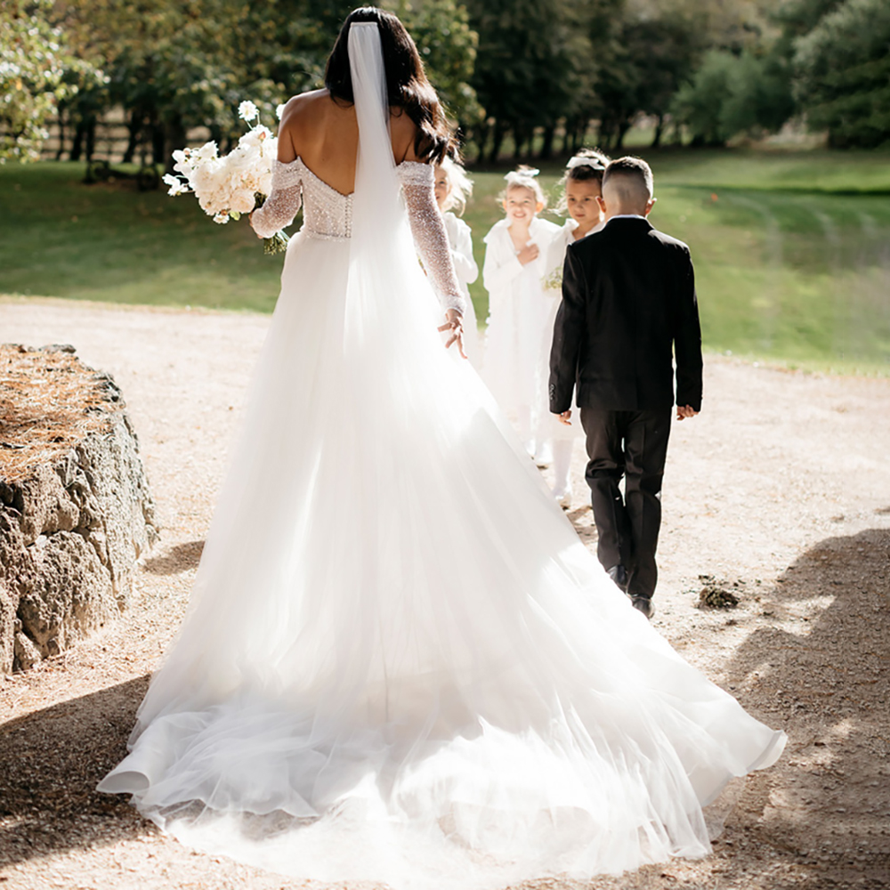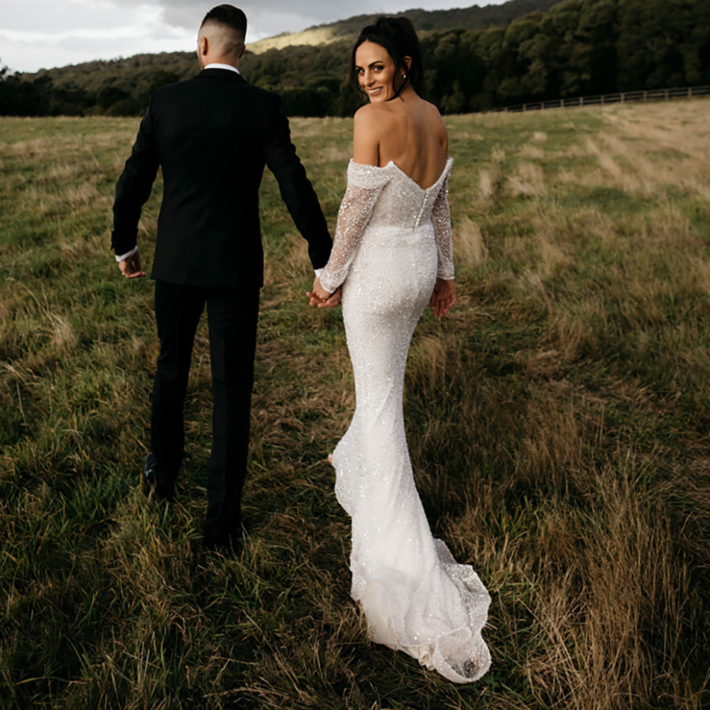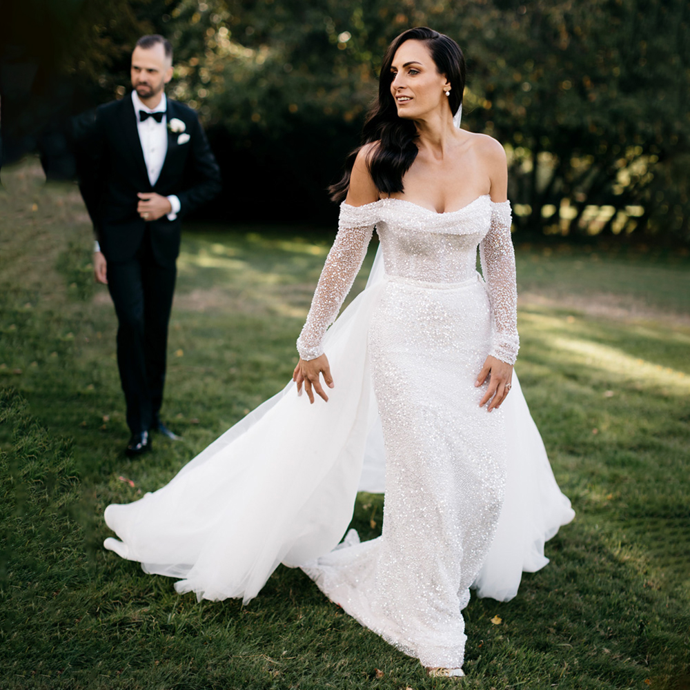 Shiny Sequined Off Shoulder Mermaid Wedding Dress Custom Made Detachable Tulle Train Long Sleeves Glitter Cowl Neck Bridal Gown