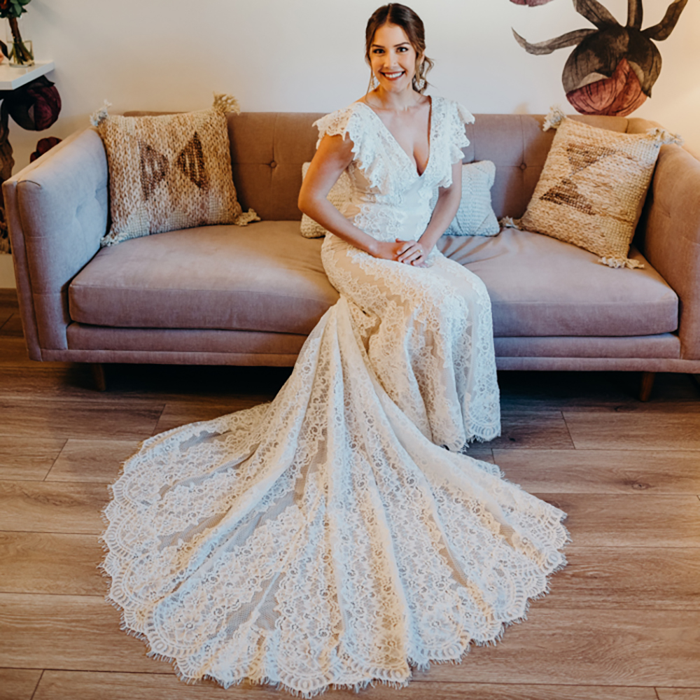 Lace Ruffled Romantic Cathedral Wedding Dress V Neckline Open Back Sleeveless Custom Made Mermaid Garden Sweep Train Bridal Gown