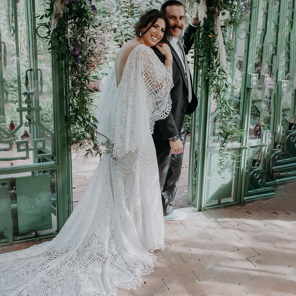 Cascading Flutter Sleeves Graphic Lace Wedding Dress V Neckline Backless Custom Made Rustic Boho Mermaid Fitted Bridal Gown