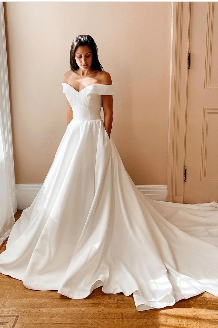 A-line Satin Long Train Bridal Gown Off-the-shoulder