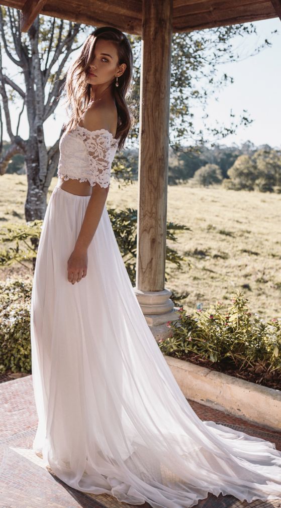 Boho Two Piece Off the Shoulder Lace Chiffon Beach Wedding Dress