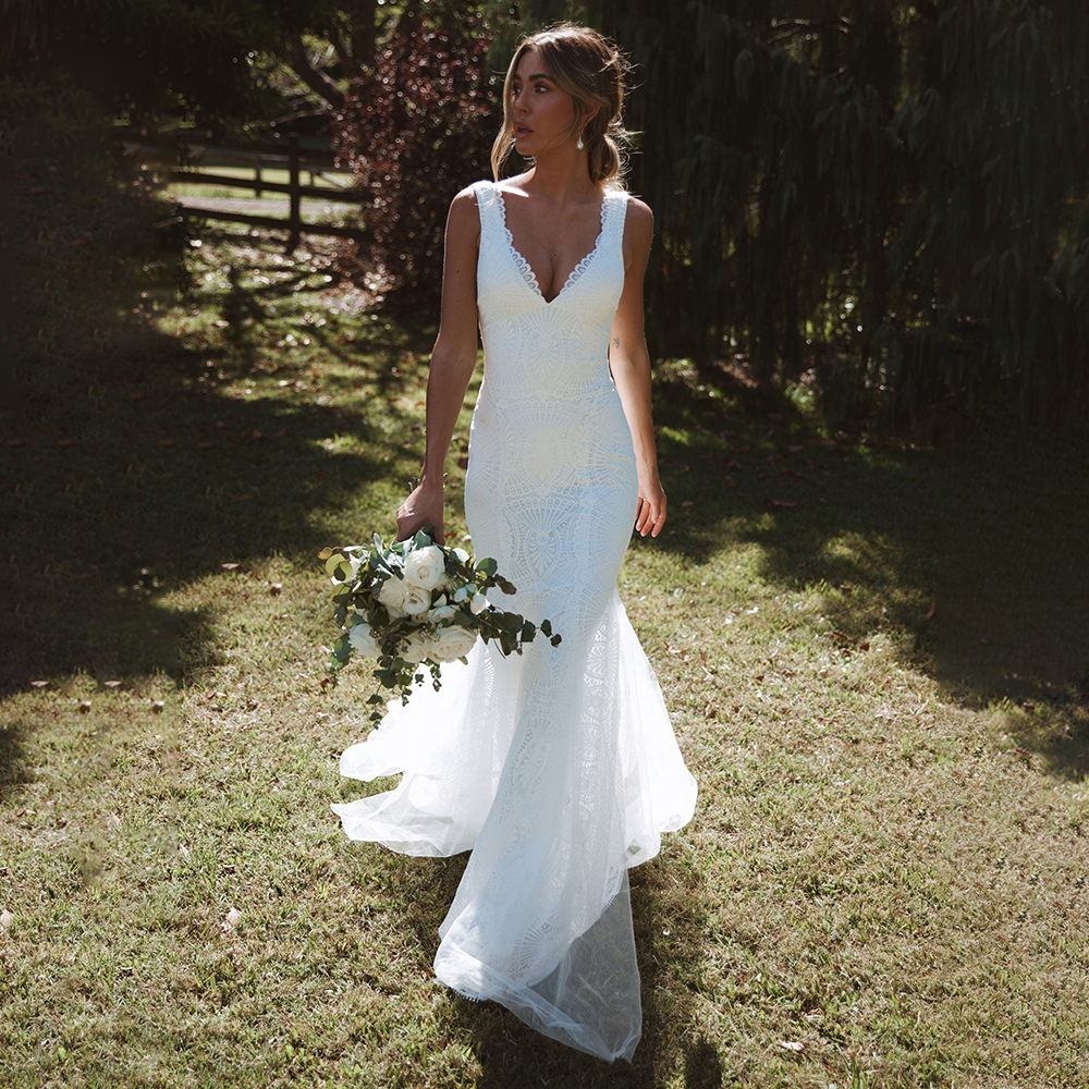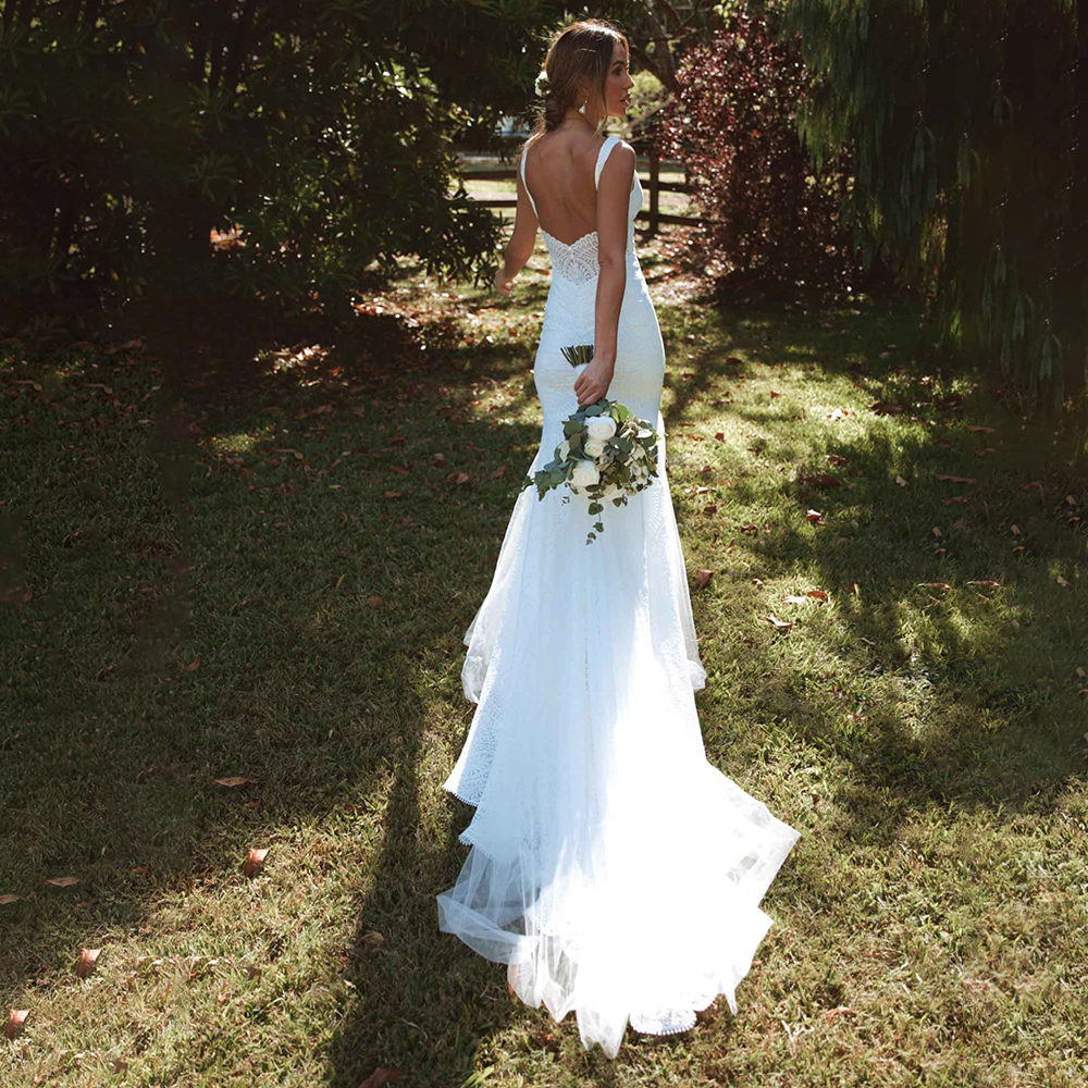 Boho Allover Lace Open Back Mermaid Wedding Dress Custom Made V Neck Fit and Flare Outdoor Backless Elgant Garden Bridal Gown