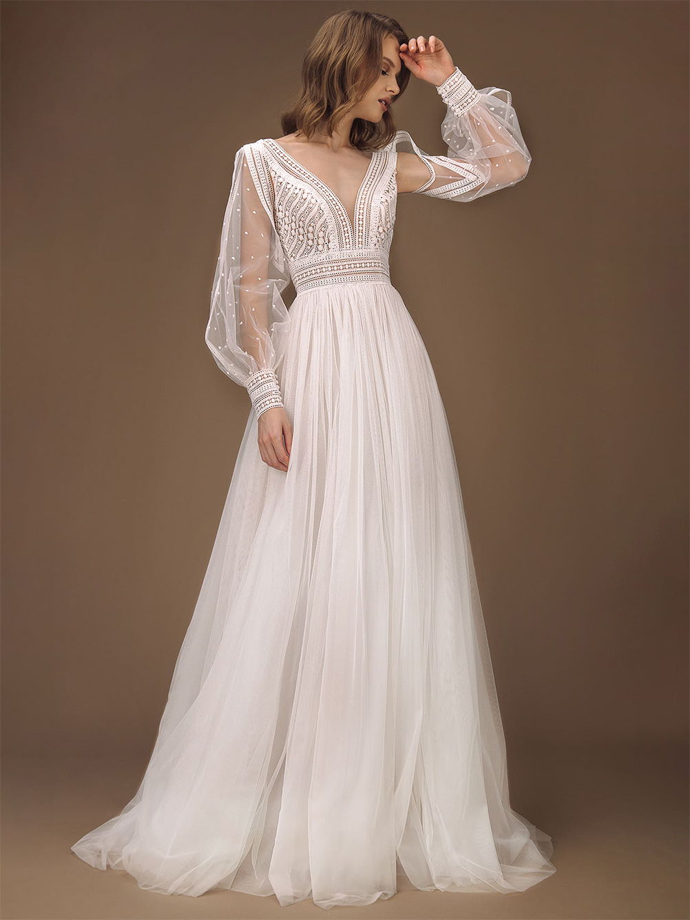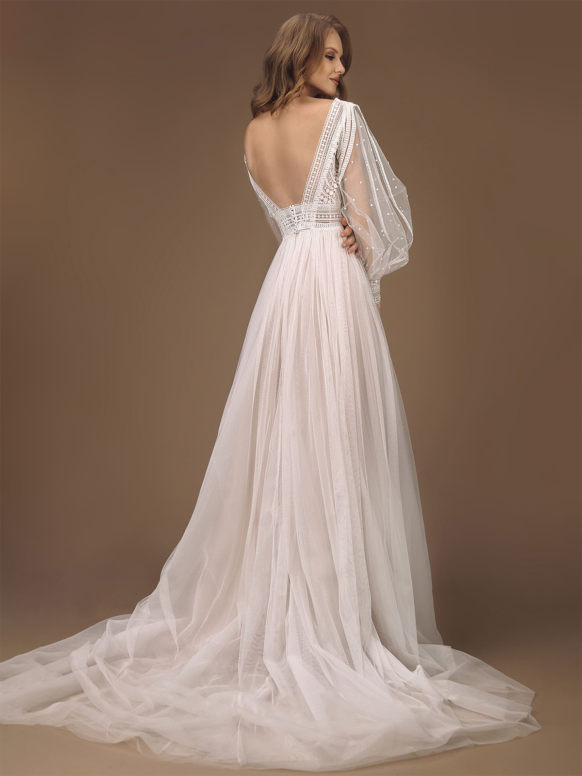Boho Long Puffy Sleeves Appliques Lace Tulle Low Back A-line Wedding Dress Bridal Gown