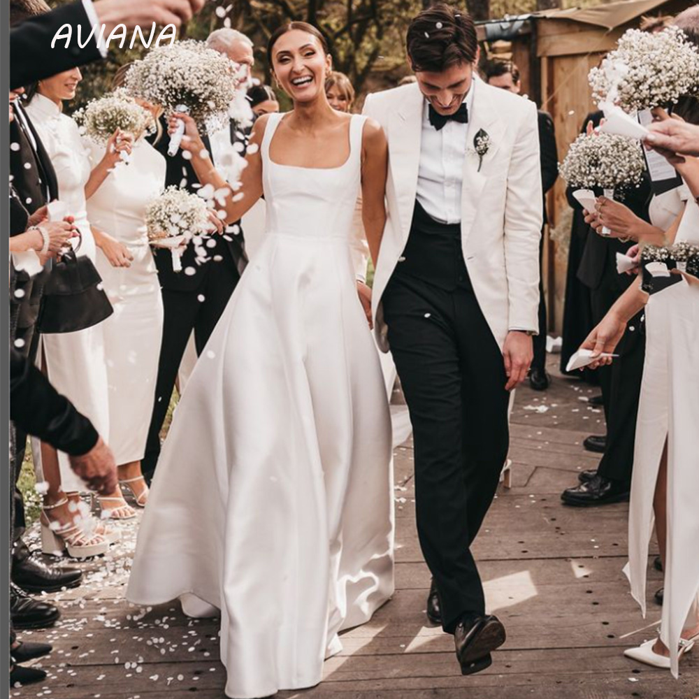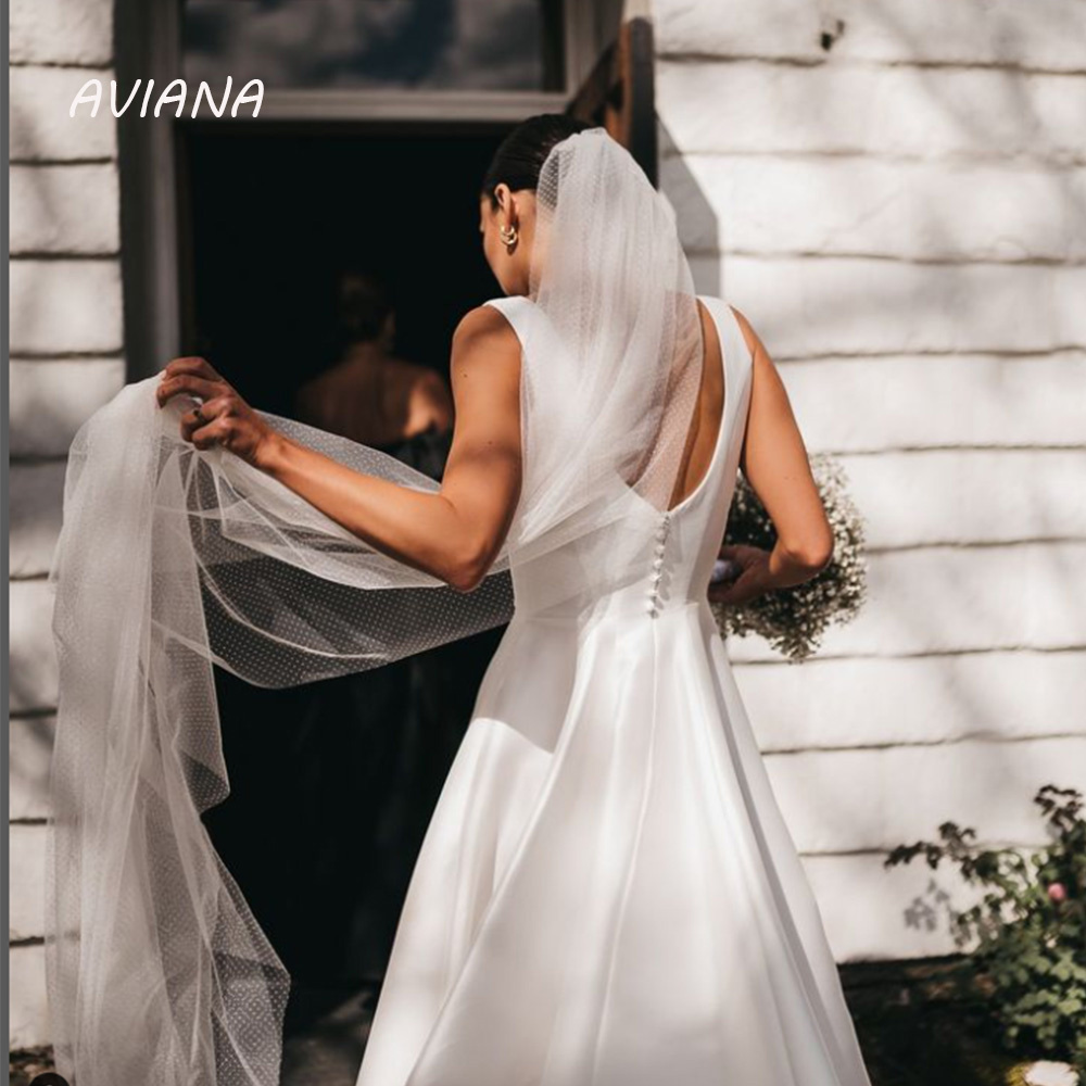 Elegant Square Wedding Dresses For Women Sleeveless Backless A-Line With Button Sweep Train Simple Satin Bridal Gown