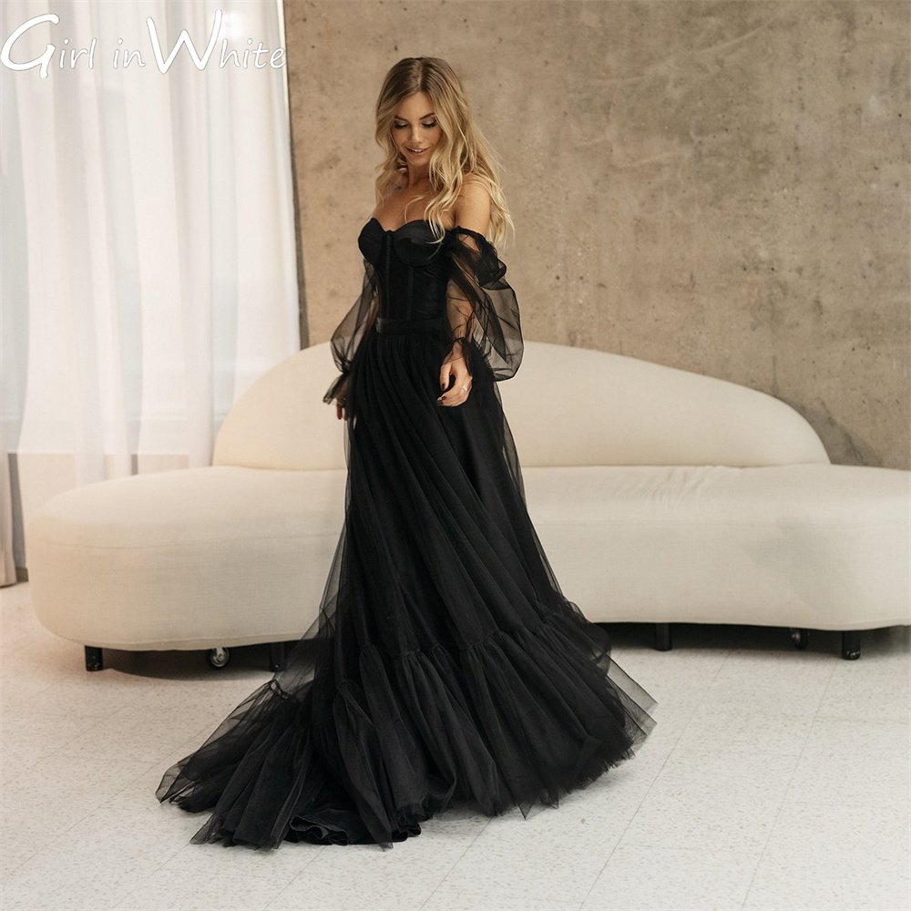 Princess Black Tulle Wedding Dress A Line Off The Shoulder Wedding Gown Lace Up Back Bridal Gown