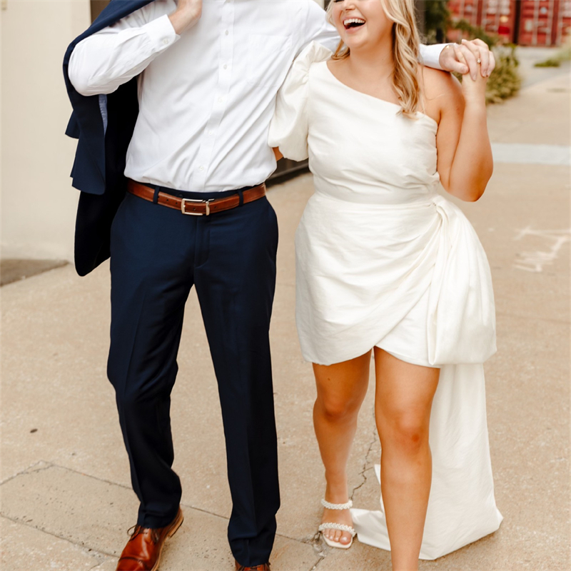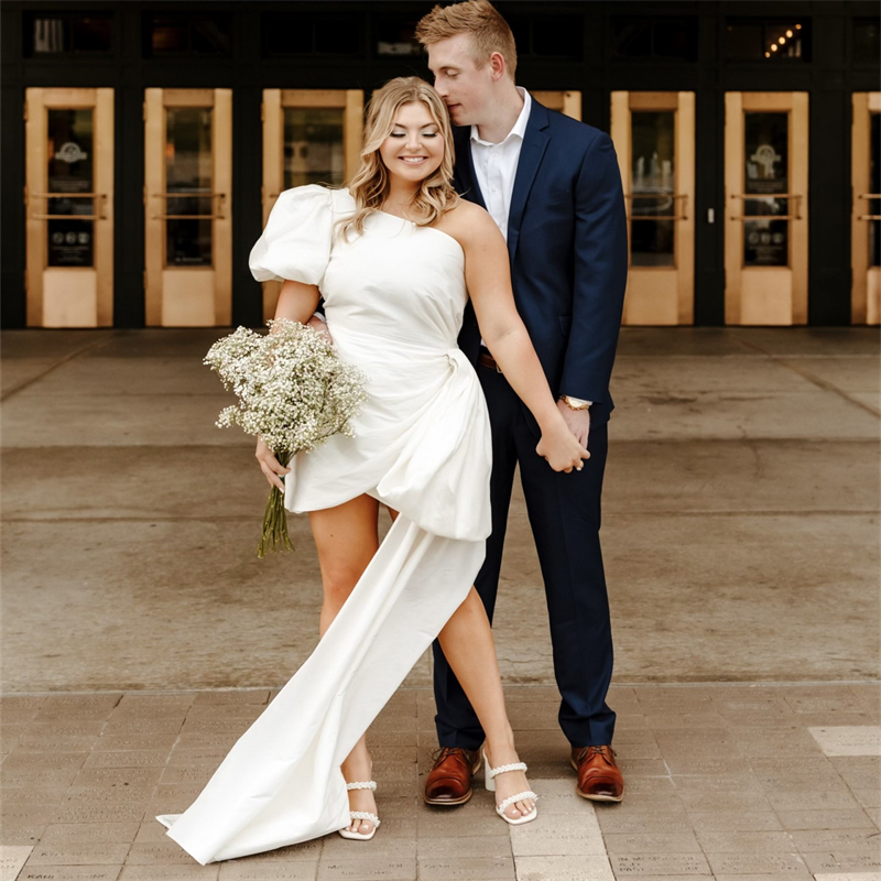 Simple Short Sheath One Shoulder Puffy Sleeve Wedding Dress Bow Stain Bridal Gown