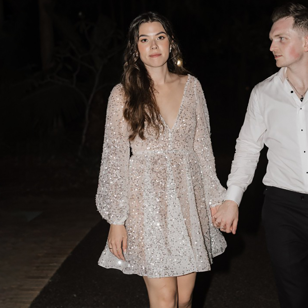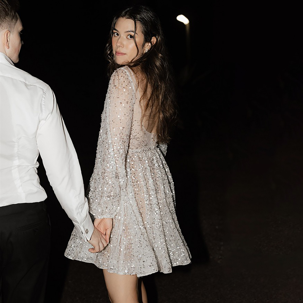 Sparkly Sequin Tulle Long Puff Sleeves Mini Short Wedding Party Dress V Neck Backless Above Knee Beading Bridal Gown