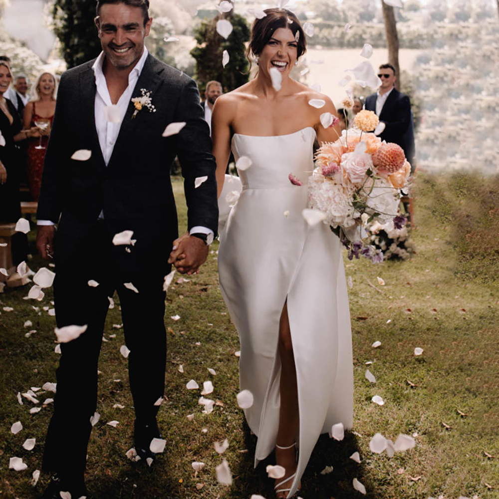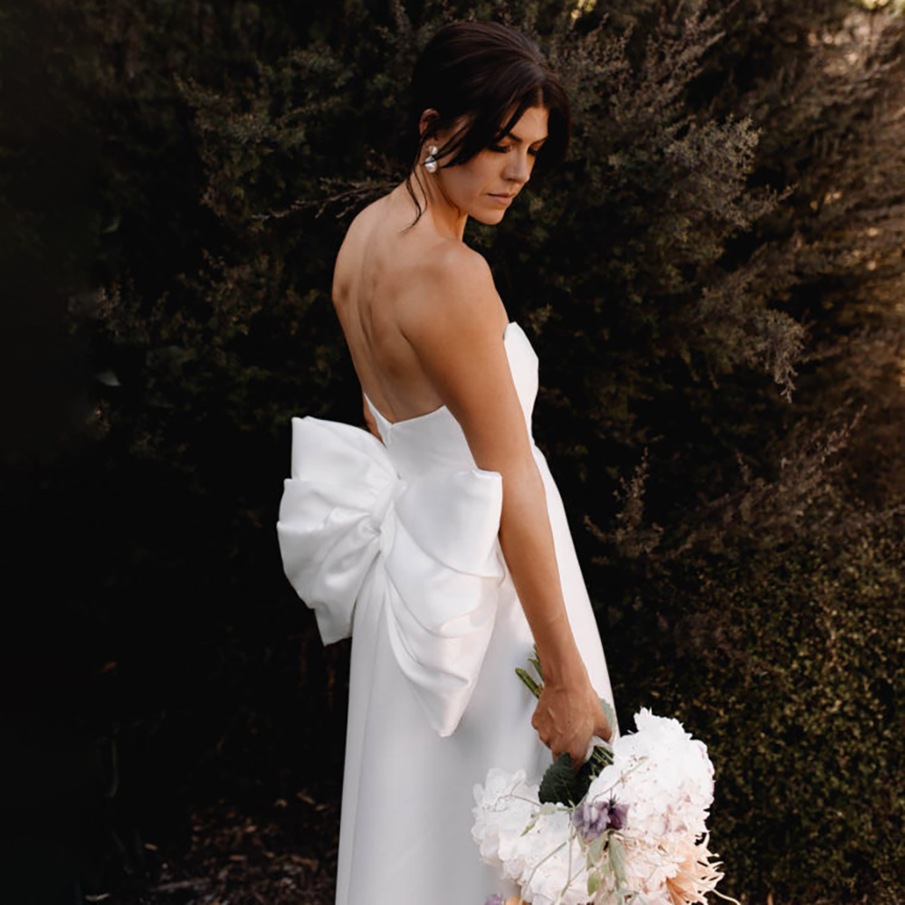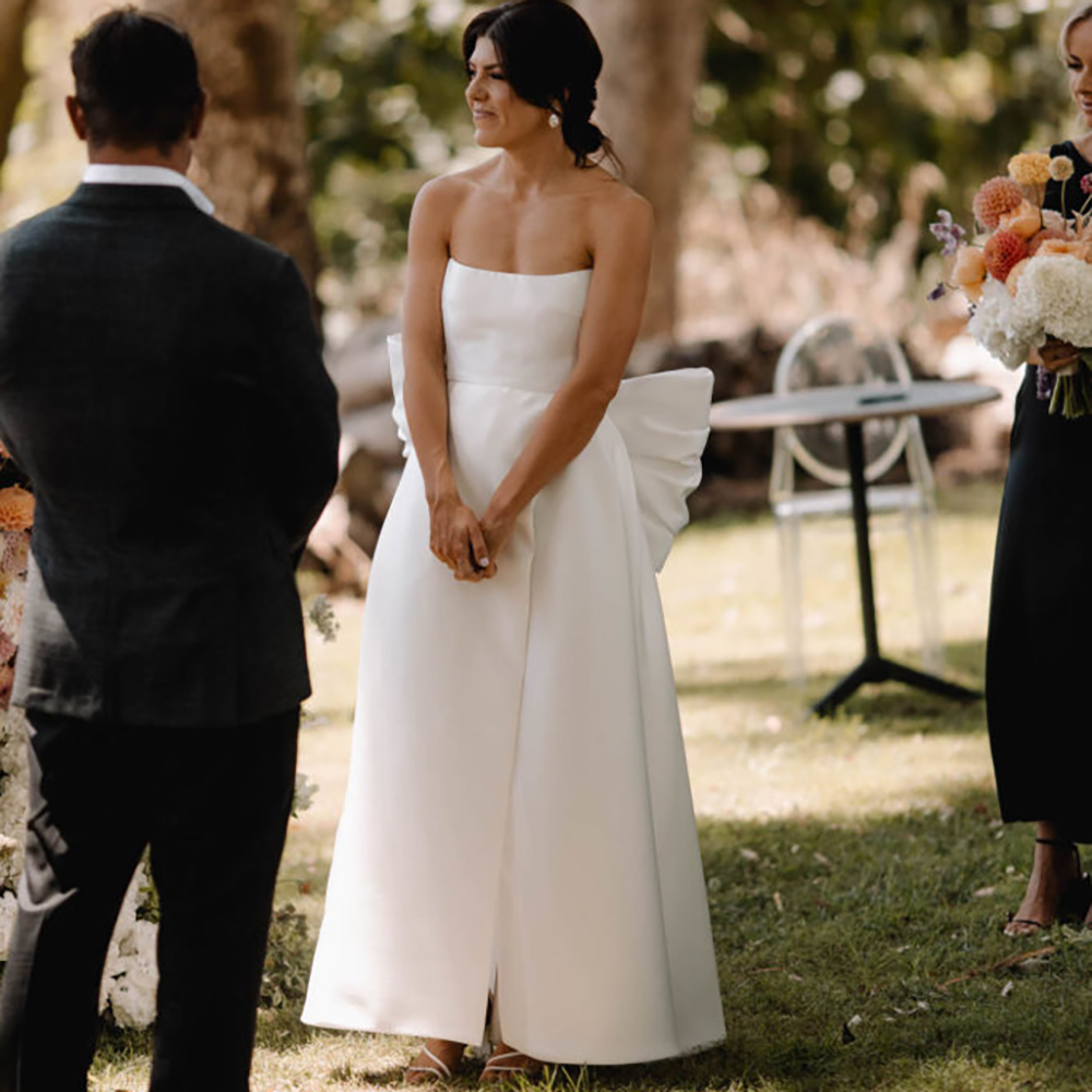 Ankle Length Strapless Satin Simple Wedding Dress Plus Size Custom Made Oversized Removable Bow High Split Chic Bridal Gowns