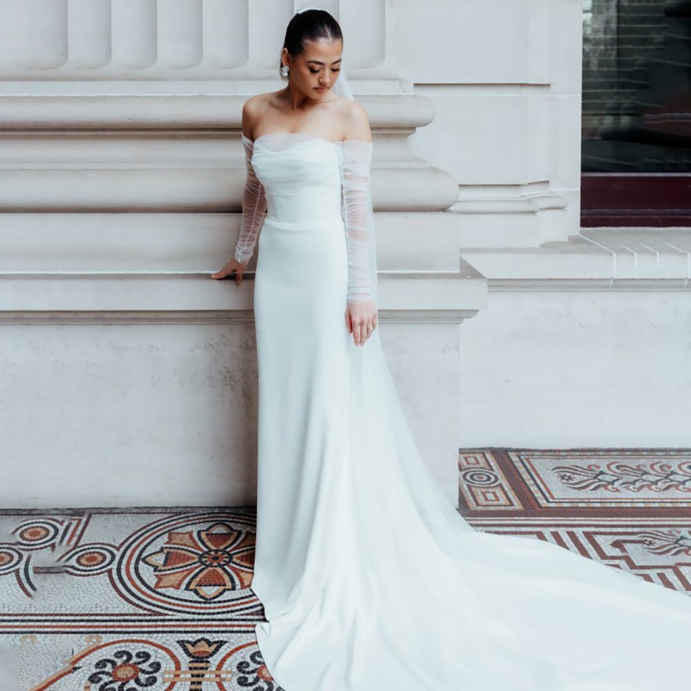 Sweetheart Neckline Sheath Open Back Minimalist Wedding Dress Custom Made Chic Pleated Tulle Long Sleeves Buttons Bridal Gowns