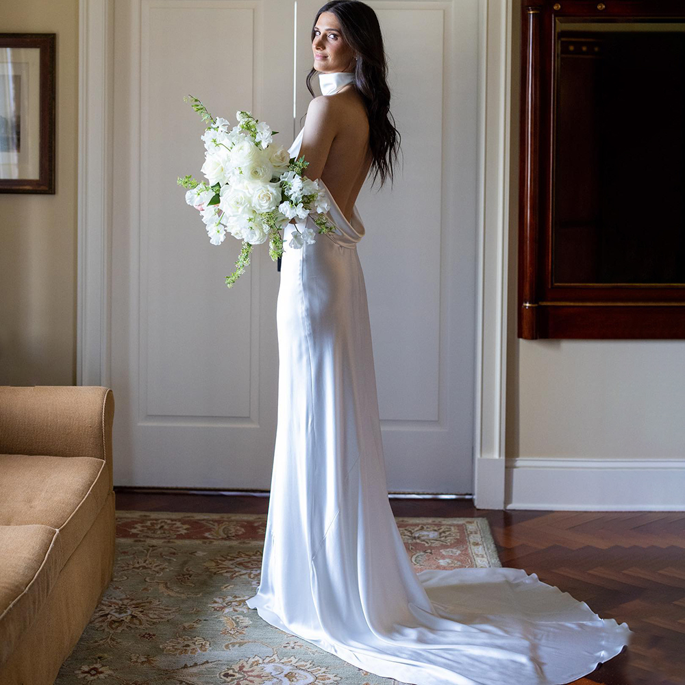 Backless Simple Lustrous Satin Column Minimalist Wedding Dress Drop Ship Sheath High Halter Neckline Ruched Sexy Bridal Gowns